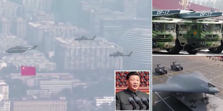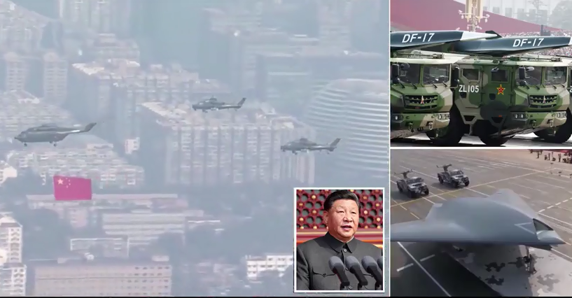 I veshur me uniformën tipike maoiste, nga makina presidenciale, Xi ndoqi paradën ushtarake, e cila shpalosi armatime të rënda si Df-41, raketa balistike ndërkontinentale të afta për të transportuar deri në dhjetë raketa bërthamore dhe për t’u kthyer në një kërcënim të mundshëm për të gjithë territorin e SHBA-ve.