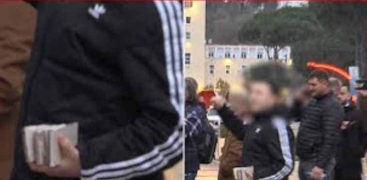 Ai shihet i afruar në gardhin e vendosur nga Policia e Shtetit me disa moshatarë të tjerë ndërsa në dorë mban disa pllaka.