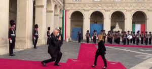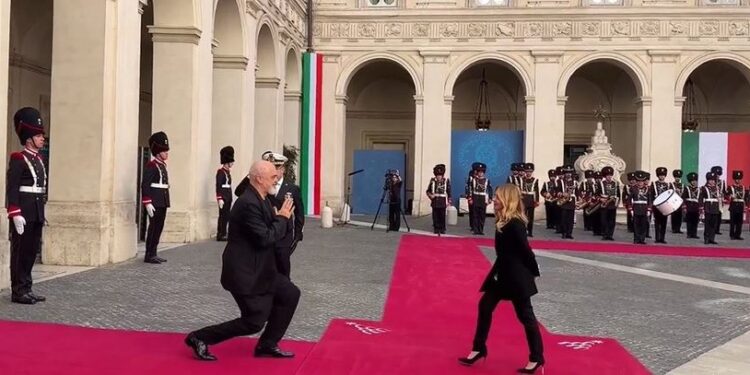 Kryeministri Edi Rama po zhvillon sot një vizitë zyrtare në Itali. Ai është pritur nga kryeministrja italiane Giorgia Meloni në Pallatin Chigi. Gjatë ceremonisë së pritjes shefi i qeverisë pati të njëjtën përshëndetje për homologen italiane, duke iu ulur sërish në gjunjë.