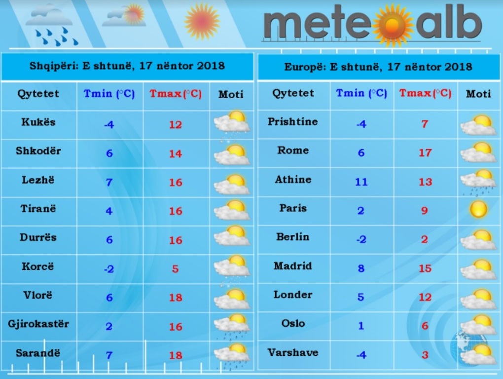 Sipas MeteoAlb, temperaturat e ajrit ulen në mëngjes dhe mesditë duke shënuar -5°C në zonat malore ndërsa maksimumi do të arrijë deri në 18°C në zonat bregdetare.