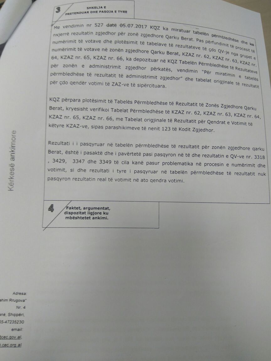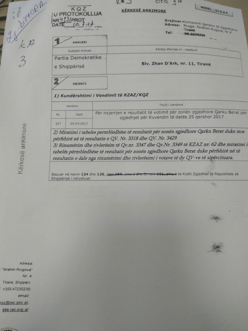 Tashmë PD ka nisur kontestimet në KQZ. Bëhet fjalë për dy kuti votimi në qarkun e Beratit. Kërkesa është depozituar në KQZ dhe pritet të shqyrtohet. PD pretendon se në tabelat e rezultateve nuk pasqyrohet rezultati real.
