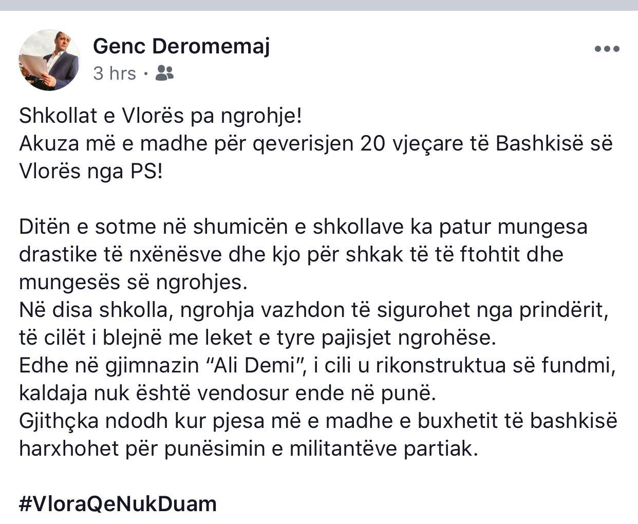 Kryetari i Partisë Demokratike në Vlorë, Genc Deromemaj ka reaguar këtë të martë ndaj problematikave që po hasin shkollat e vendit për ngrohjen e ambienteve. Përmes një postimi në një rrjet social, Deromemaj ka akuzuar për gjendjen aktuale të shkollave në Vlorë Partinë Socialiste dhe politikat korruptative që ka ndjekur kjo e fundit karshi buxhetit të bashkisë, duke e përdorur për punësimin e militantëve partiakë.