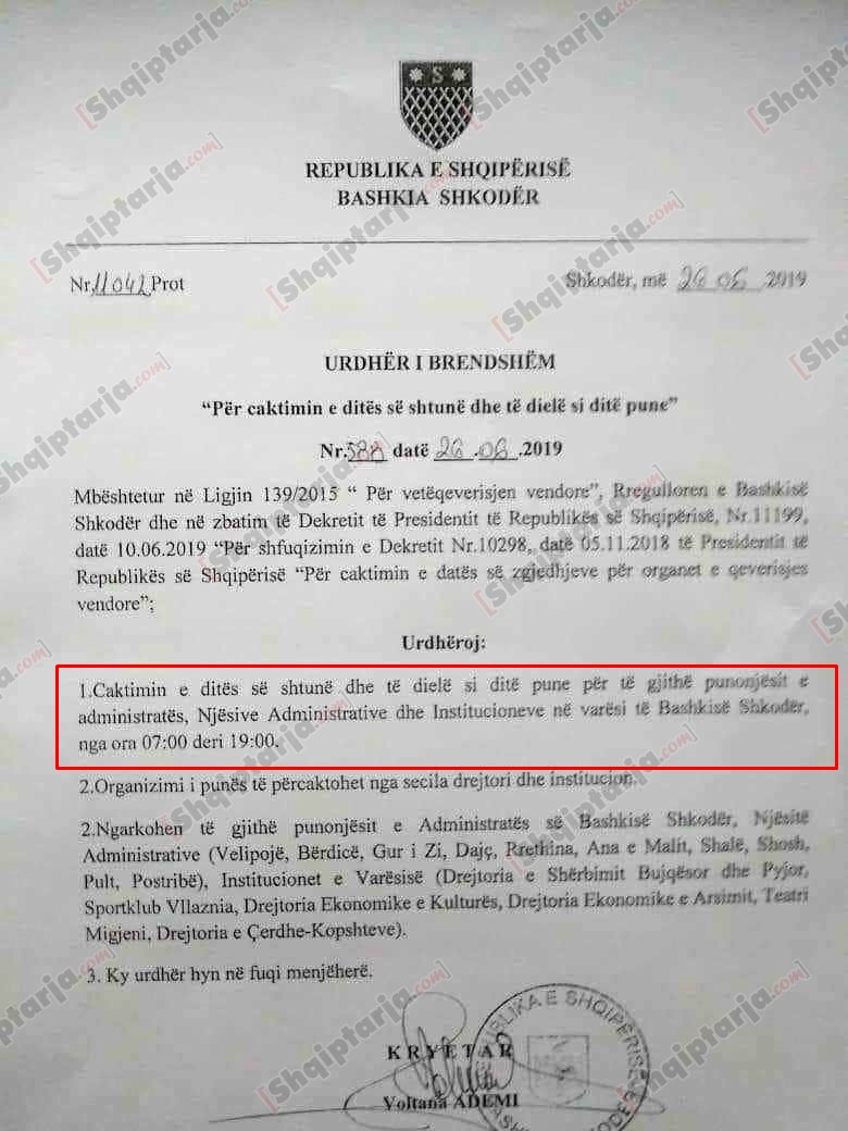 Urdhri është për të gjithë punonjësit e administratës, njësive administrative dhe institucioneve në varësi të Bashkisë së Shkodrës.