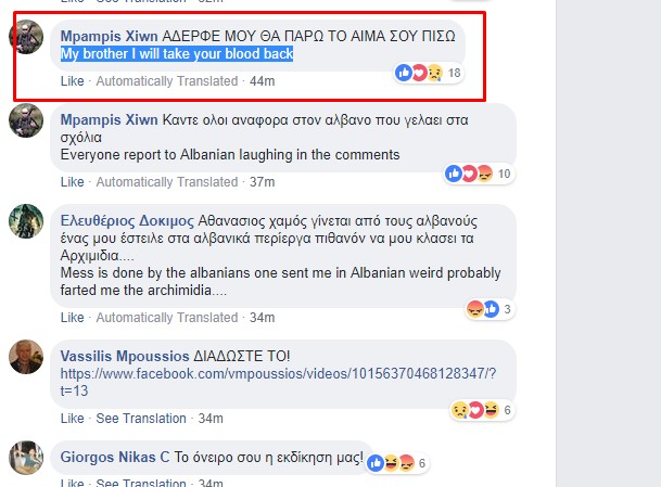 Ndër to bien në sy komente ekstremiste por edhe ngjushëllime si “I përjetshëm”, apo “Do shkosh në Parajsë”. Mëgjithatë nuk mungojnë as komente kërcënuese të tipit “Gjaku lahet me gjak” apo “Do marrim hak”, si dhe postime të fotografive të ushtrisë greke, raporton newsbomb.al. Personat që shikoni më poshtë premtojnë të hakmerren për vrasjen e “vëllait të tyre”.
