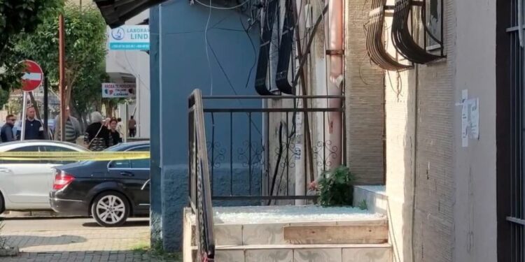 Aty shihen forca të shumta policie, ekspertë të kriminalistikës dhe shenja të plumbave në xhamin e një dere. Sakaq, e gjithë zona është e rrethuar nga shiritat që tregojnë skenën e krimit.
