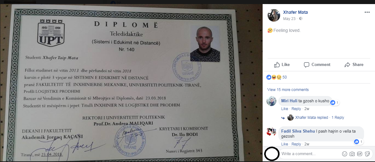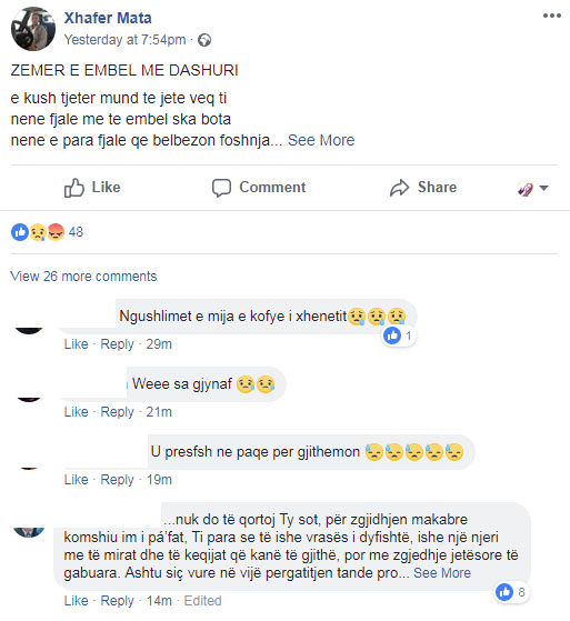 Vetëm katër ditë përpara ngjarjes, i riu në profilin e tij në rrjetet sociale kishte ndarë një postim të vjetër ku shkruante ndër të tjera: – Luftova , humba shpirtin pas saj. Shita shpirtin pas asaj dashurie , kalova cdo nate duke ndertuar endrra , edhe iluzione. Kalova nete pa gjume , duke e menduar! Duke menduar qe ne altar te ishte ajo me fustan te bardhe edhe une te jem dhendrri. Enderrova me ate. Por edhe pse e desha me shume se veten , kjo gje nuk mjaftoi. — në Dajti Mountain.