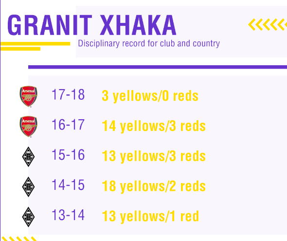 Mesfushori kosovar, Granit Xhaka në edicionin e parë në Arsenal ishte ndëshkuar 14 herë me karton të verdhë dhe 3 herë me karton të kuq.