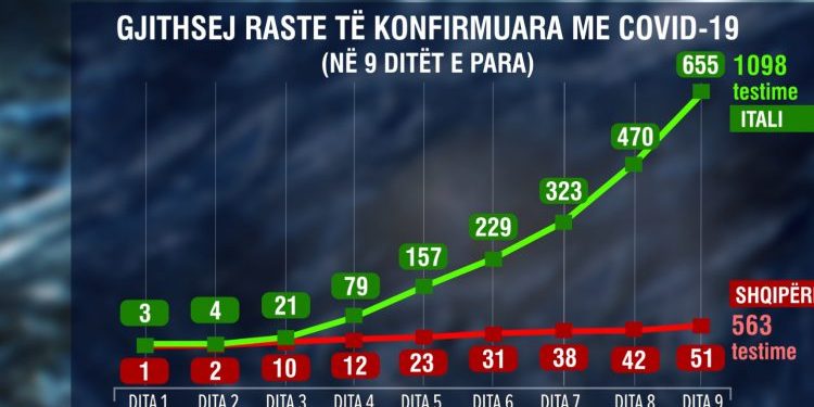 Ndërsa numri i rasteve të konfirmuara mori një të përpjetë të frikshme në 9 ditët e para në komunat e prekura në Itali, ndërkohë që në Shqipëri kurba e rritjes është shumë e butë. /e.s/