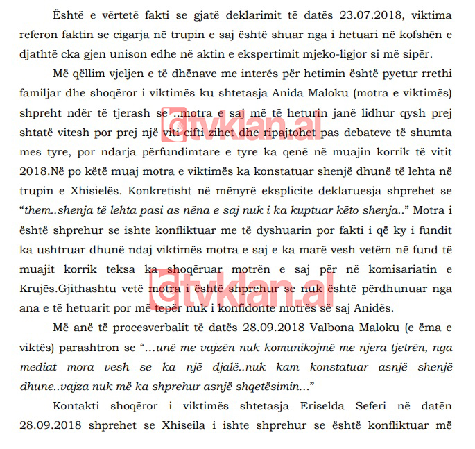 Në Korrik 2018, Xhisiela i dha fund lidhjes me djalin e deputetit, thotë A.Maloku. Para hetuesve, ajo ka pohuar se kishte vënë re shenja dhune në trupin e motrës së saj dhe e kishte shoqëruar në Komisariatin e Krujës për të bërë kallëzim.
