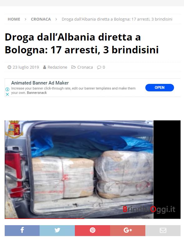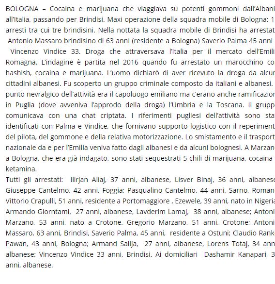 Sipas asaj që shkruajnë mediat e vendit fqinj, ndër të tjera janë prangosur edhe 3 shoferë, italianë nga Brindizi të dyshuar si bashkëpunëtorë. Policia italiane kreu arrestimet e 3 shtetasve italianë Antonio Massaro nga Brindisi (banor i Bolonjës) Saverio Palma 45 vjeç dhe Vincenzo Vindice 33 vjeç. Droga ishte sjellë nga Shqipëria dhe si destinacion final kishte Emilia Romanjan. Hetimi ka filluar në vitin 2016, atëherë kur u prangos një maroken nën akuzën e trafikut të drogës. Ai u kap me hashash, kokainë dhe marihuanë.