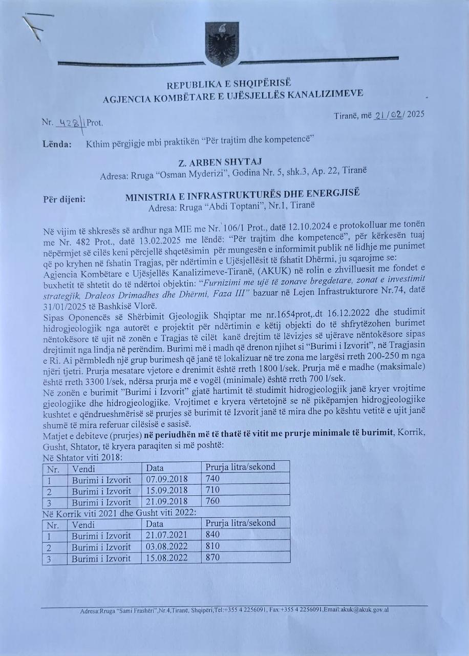 Është zbuluar nga mediat dokumenti i plotë për projektin e ujësjellësit të Tragjasit. Sipas dokumentit të lëshuar nga Agjencia Kombëtare e Ujësjellës Kanalizimeve vetë burimi i ujit nga viti 2018 deri në vitin 2022 është rritur nga 740 litra në sekondë në 870 litra në sekondë. Analizat konkrete kundërshtojnë atë çfarë u është thënë banorëve deri më tani që uji i burimit është në rënie. Sipas dokumentit prurjet janë të mjaftueshme për të mbuluar fshatin Tragjasë nga 2 orë në 24 orë, nevojat bujqësore të të gjithë zonës dhe nevojat e industrisë së turizmit në këtë krahinë. Dokumenti thuhet “Theksojmë se diferenca e prurjes minimale prej 700 – 430 = 270 litra/sekondë është e mjaftueshme për të ruajtur mjedisin përreth si prurje ekologjike por gjithashtu edhe për t’u përdorur për vaditjen e tokave bujqësore të fshatit Tragjasë.”