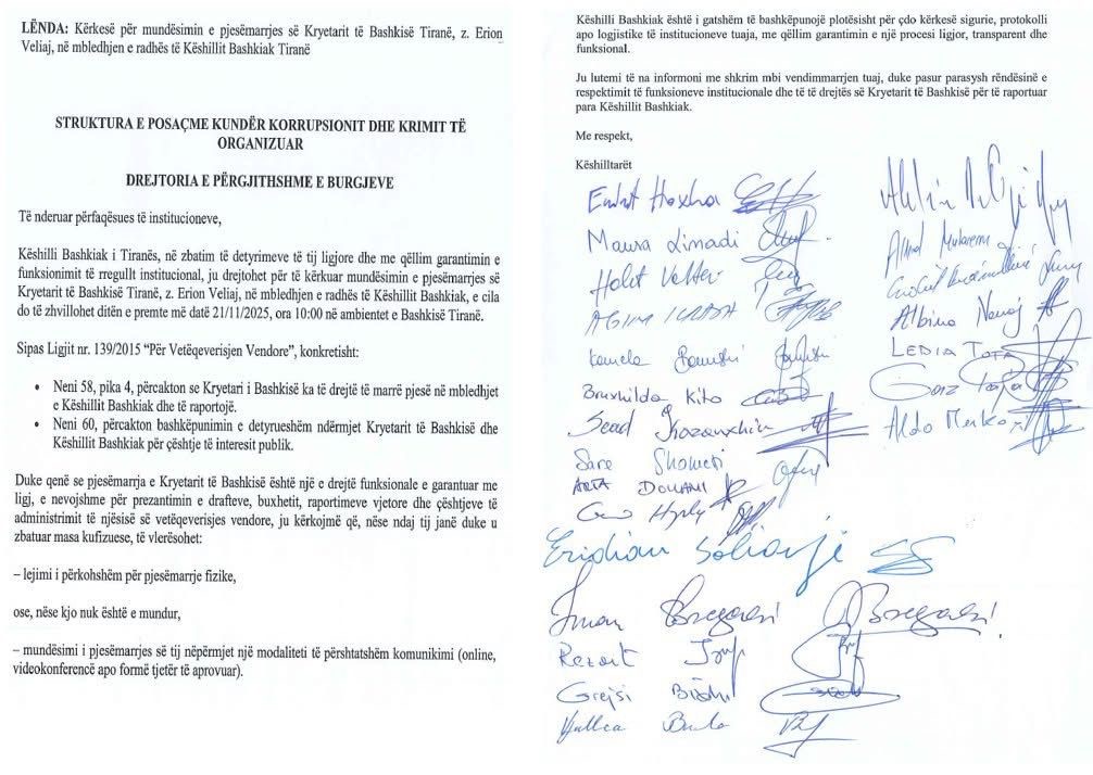 Kërkesa për kryebashkiakun Erion Veliaj e firmosur nga 22 anëtarë të Këshillit Bashkiak: