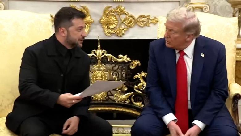 Presidenti ukrainas Volodymyr Zelensky i dorëzoi Presidentit të SHBA-së Donald Trump një letër nga Zonja e Parë e Ukrainës drejtuar Melania Trump. Në nisje të takimit mes tyre në zyrën iovale të Shtëpisë së Bardhë, Zelensky falënderoi Trumpin për ftesën e tij dhe për “përpjekjet e tij personale” për të ndaluar luftën.