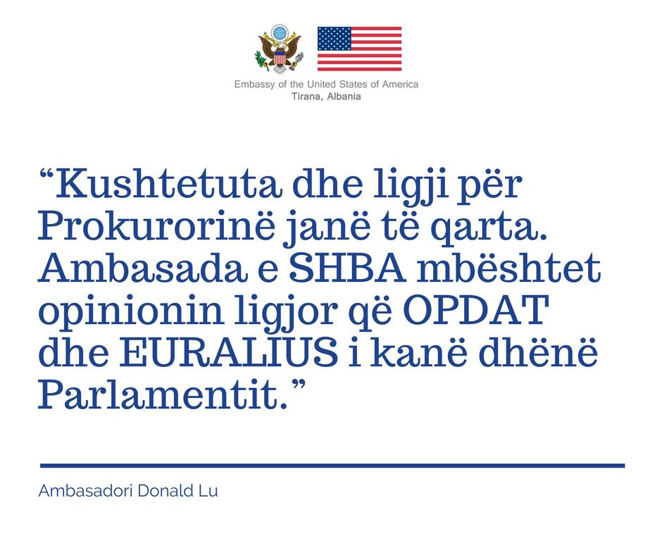 “Kushtetuta dhe Ligji për prokuroinë janë të qarta. Ambasada e SHBA mbështet opinionin ligjor të që OPDAT dhe EURALIUS i ka dhënë parlamentit’ deklaron Donald Lu.