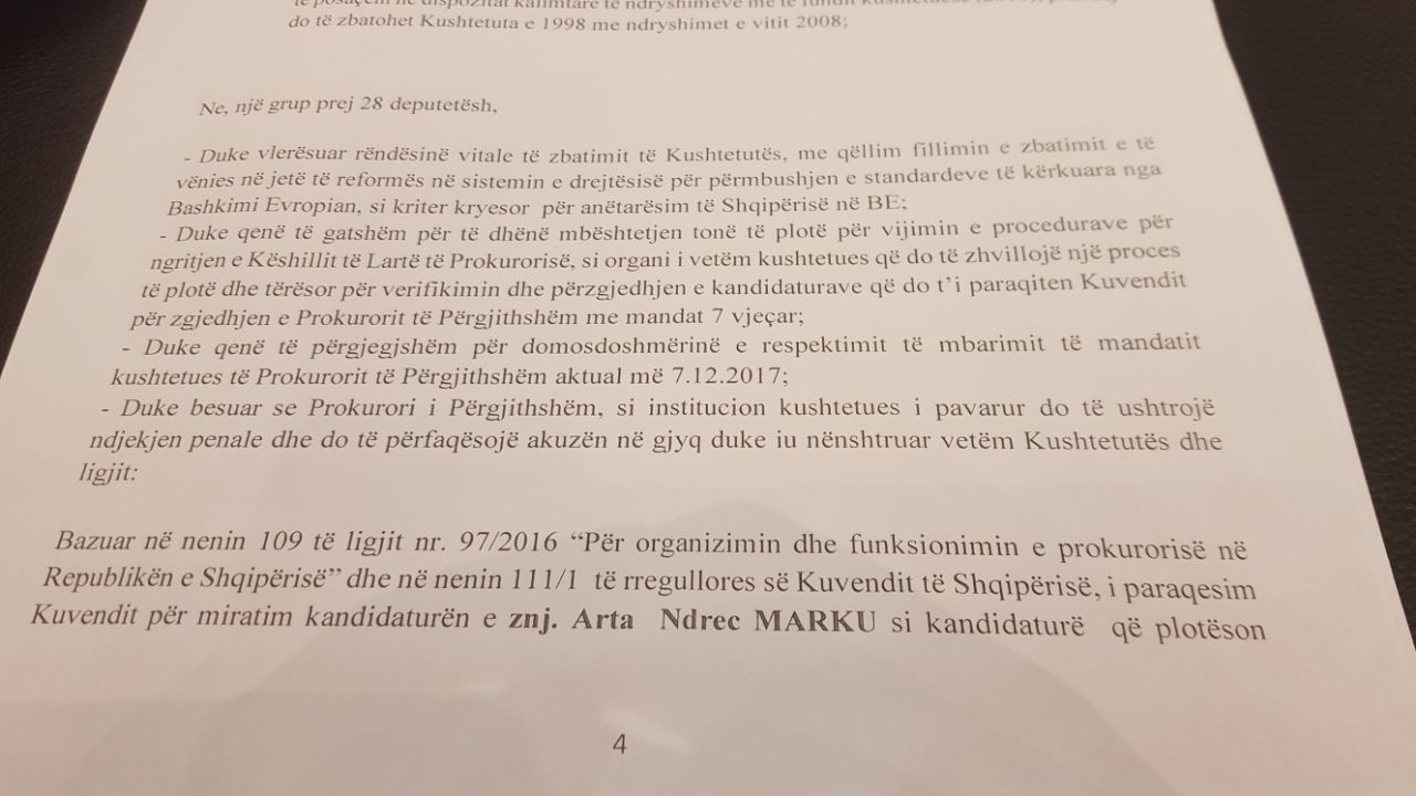 Zbulohet dokumenti i Kuvendit me firmen e 28 deputeteve te shumices. Pas mbledhjes se grupit te PS-se, eshte zyrtarizuar kandidatja zyrtare per kryeprokurore, qe do te votohet sot ne Kuvend. Ajo eshte Arta Marku.