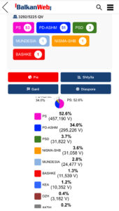 Partia Socialiste e Shqipërisë (PS) ruan avantazhin bindës me 420,558 vota, që përbëjnë 52.67% të totalit.