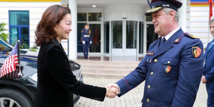 “Ambasadorja Kim dhe Drejtori i Policisë së Shtetit Shqiptar Rrumbullaku diskutuan bashkëpunimin në rritje SHBA-Shqipëri në zbatimin e ligjit kundër rrjeteve kriminale, trafikut të drogës dhe kërcënimeve kibernetike.