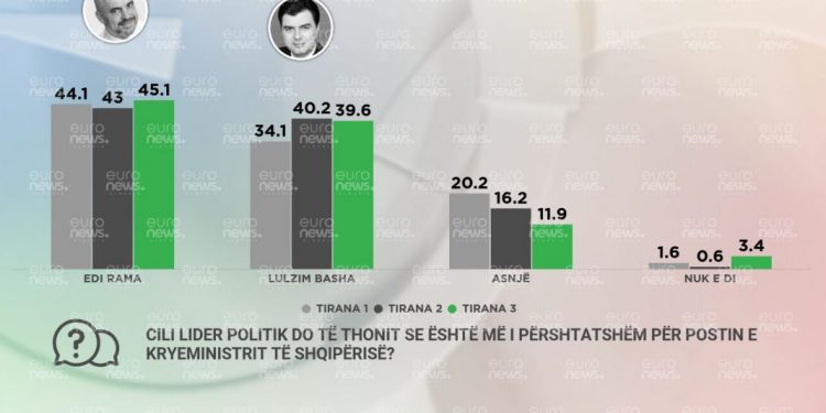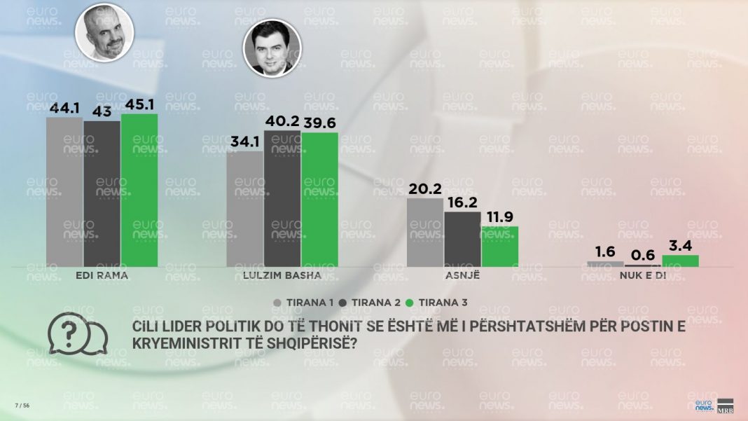 Ndërkohë pyetjes se cilin prej dy liderëve shohin si personin më të përshtatshëm për të qenë kryeministri i Shqipërisë, 45.1% shprehen në favor të Edi Ramës kurse 39.6% preferojnë Lulzim Bashën. 11.9% nuk preferojnë asnjërin prej të dyve ndërsa 3.4% thonë se nuk e dinë.