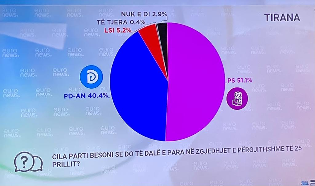 Nëse zgjedhjet parlamentare do të mbaheshin të dielën Partia Socialiste do të kryesonte në qarkun e Tiranës, sondazhi nga Euronews tregon se 51.1% preferojnë Partinë Socialiste.