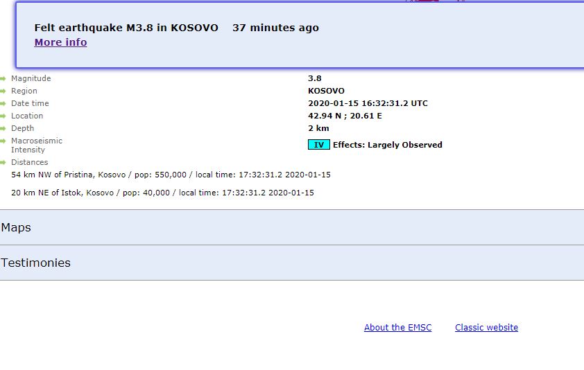 Një tërmet me magnitudë 3.8 ballë ka rënë sot në Kosovë. Fillimisht u raportua për tërmet 4.3 ballë, ndërsa më tej tërmeti rezultoi se ishte 3.8 ballë.