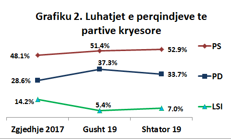 Sot PS-ja do të merrte pothuaj 53% të votave të pjesëmarrësve në zgjedhje; PD-ja pothuaj 34%; LSI-ja 7%; PDIU rreth 3%, dhe partitë e tjera të vogla rreth 3% (grafiku 2).