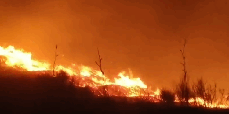 Për momentin nuk ka rrezik për banesat, por era e fortë po ndihmon përhapjen e flakëve që po djegin shkurre, ferra dhe dru. dhe po e vështirëson punën e zjarrfikësve.