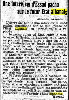 “L’Acropolis” boton një intervistë me Esat Pashën. I pyetur se çfarë mendon mbi formimin e shtetit shqiptar, ai u përgjigj :