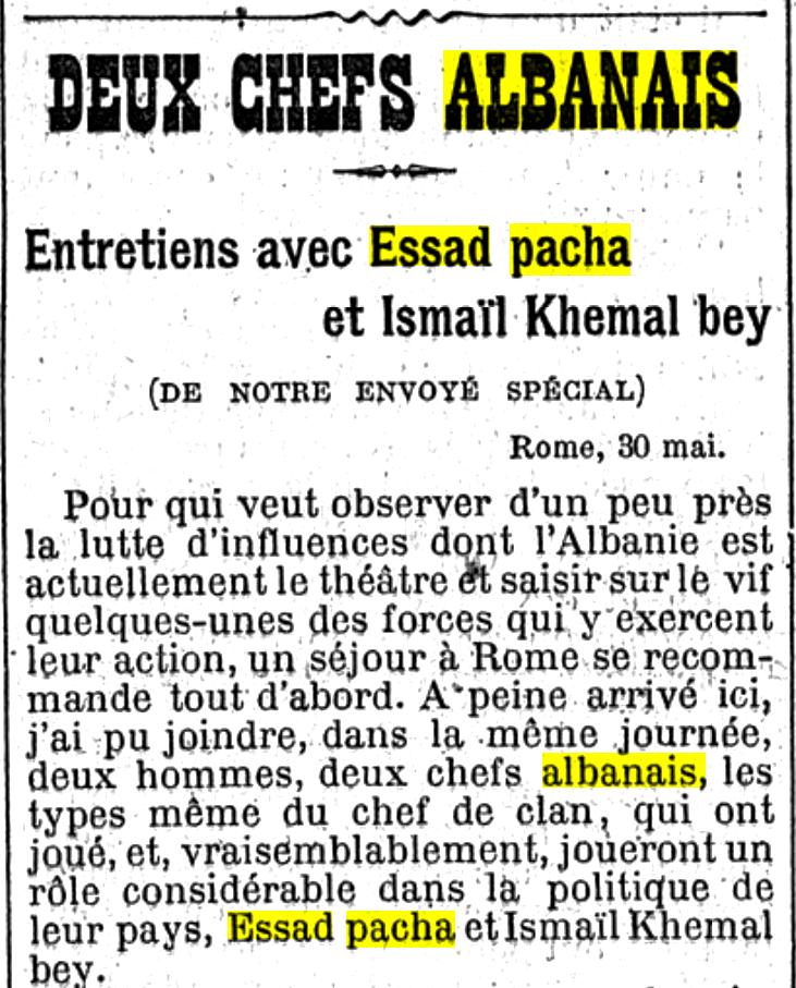 Për ata që duan të kenë një vështrim më të afërt mbi luftën e ndikimeve të së cilës Shqipëria aktualisht është teatër dhe të kuptojnë në vend disa nga forcat që ushtrojnë aksionin e tyre atje, para së gjithash rekomandohet një udhëtim në Romë. Sapo mbërrita këtu, takova, në të njëjtën ditë, dy burra, dy shefa shqiptarë, të llojit shef klani, të cilët, me sa duket, luanin dhe do të luajnë një rol të konsiderueshëm në politikën e vendit të tyre, pra, e kam fjalën për Esat Pashën dhe Ismail Qemal beun.