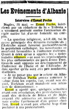 Napoli, 24 maj. – Esat Pasha, i intervistuar nga një redaktor i “La Tribuna” protestoi ashpër kundër akuzës së drejtuar ndaj tij për një organizim komploti: “Çështja fetare, tha ai, është shkaku kryesor i ngjarjeve të fundit : Pasi Austria ka favorizuar veçanërisht popullsinë katolike, myslimanët favorizojnë influencën italiane. Ndërsa ata që thërriten “nacionalistë shqiptarë”, janë përfaqësuesit më entuziastë të partisë xhonturke. Këta janë kundër përhapjes së influencës italiane dhe austriake. Gjithsesi, unë duhet të shtoj se këta janë shumë pak në numër.